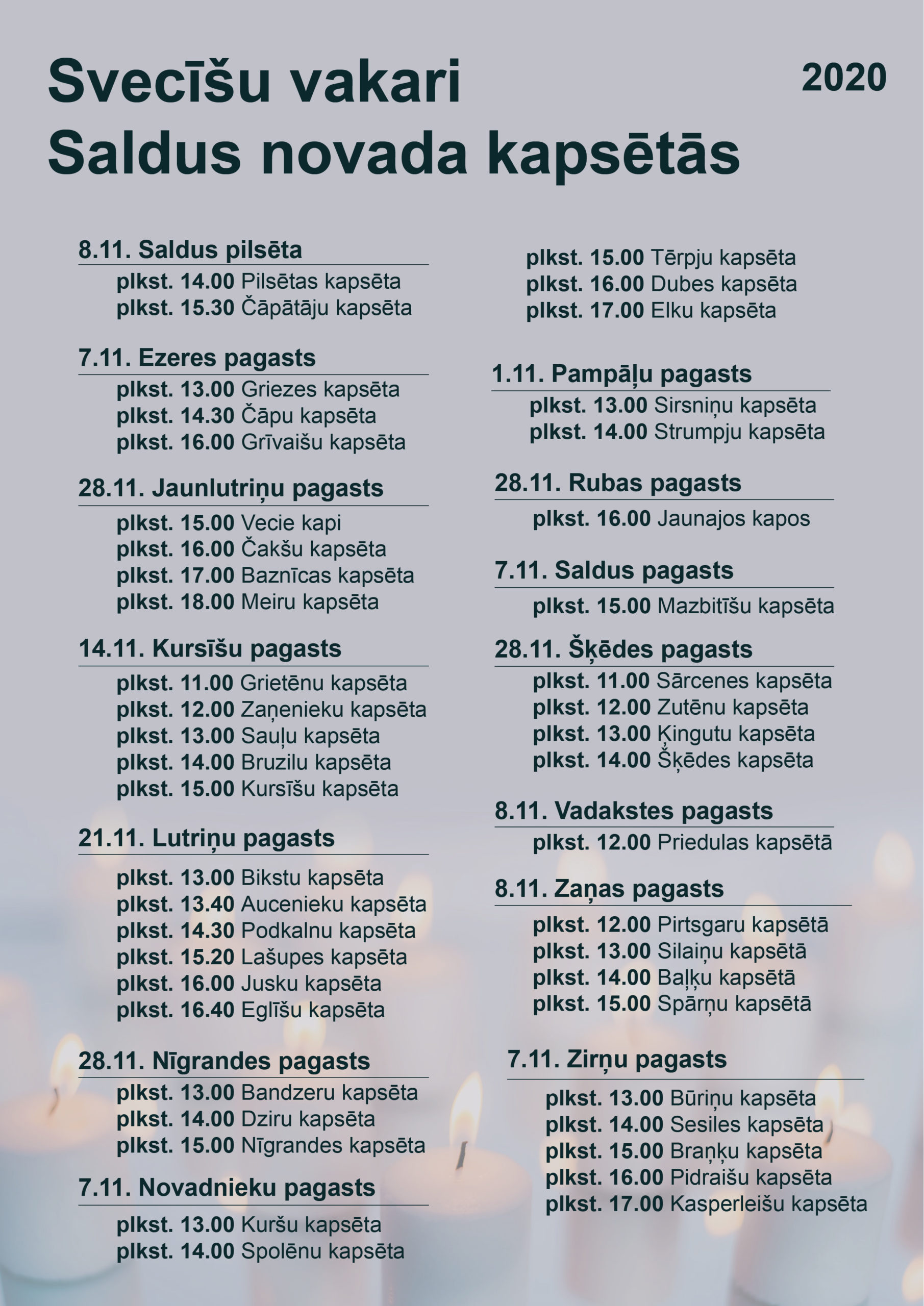 Novembra mēnesī Saldus novada kapsētās notiks svecīšu vakari. Jau šajā nedēļas nogalē, 1. novembrī, Pampāļu pagasta kapsētās, 7. novembrī – Ezeres, Novadnieku, Saldus un Zirņu pagastu kapsētās, 8. novembrī – Saldū, Vadakstes un Zaņas pagastu kapsētās, 21. novembrī – Lutriņu pagasta kapsētās un 28. novembrī – Jaunlutriņu, Nīgrandes, Rubas un Šķēdes pagastu kapsētās.